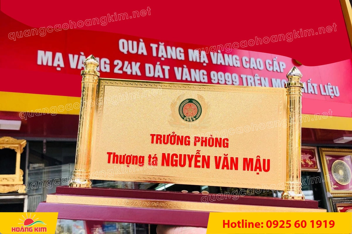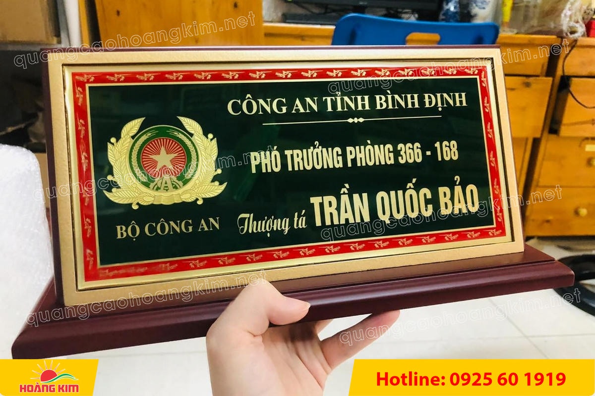 Nếu như bạn là người bận rộn nhưng vẫn muốn chọn được các mẫu biển chức danh công an ấn tượng thì hãy để quảng cáo Hoàng Kim giúp bạn. Đến với công ty chúng tôi bạn sẽ có được tư vấn chi tiết, để chọn được cho mình loại biển tên chức danh để bàn công an hợp ý nhất. Công ty luôn đặt ý kiến của khách hàng làm trung tâm và đó là lý do để bạn tin tưởng rằng bạn sẽ nhận được những sản phẩm cùng dịch vụ tốt nhất khi đến quảng cáo Hoàng Kim. Bạn chỉ cần đưa ra mong muốn, yêu cầu của mình, việc còn lại hãy để chúng tôi giúp bạn hoàn thành nốt.