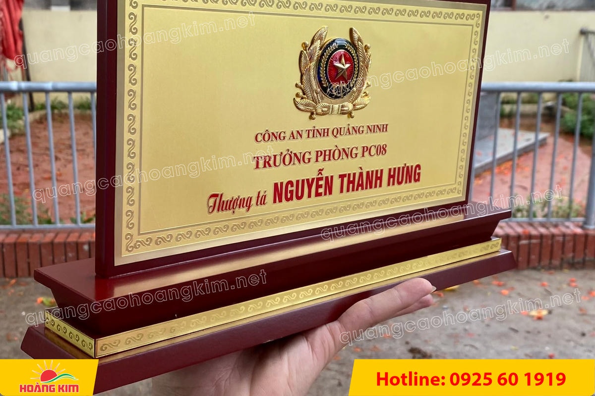 4.5 Biển Chức Danh Công An Mặt Đồng 2mm Mạ Vàng 24K – Đế Gỗ Tam Cấp